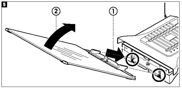 - 向上旋转防风罩顶门(6)的前部并将顶门从导轨中拉出。