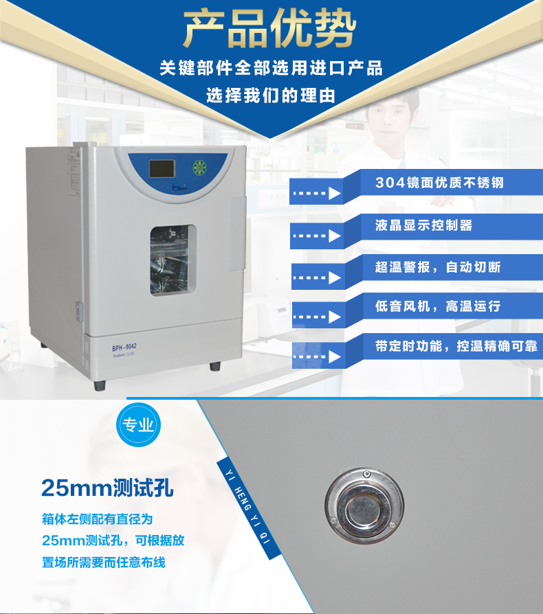 ● 镜面不锈钢内胆,电热膜加热方式,加热速度快,使箱内均匀加热。