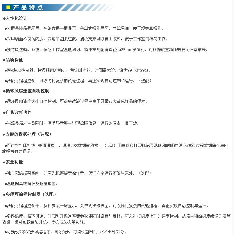 ● 多段温度、循环风速、时间和升温速率等参数能同时设置与编程,可以进行温度上升的梯度控制,从箱内初始温度缓慢升温等功能,也可预设自动开机、待机与关机等功能。