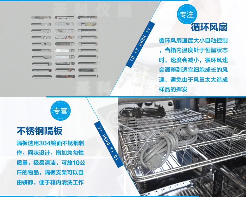 ● 循环风扇速度大小可自动控制,当箱内温度处于恒温状态时,速度会减小,循环风速会调整到适宜细胞成长的风速,避免试验过程中由于风量过大造成样品的挥发。