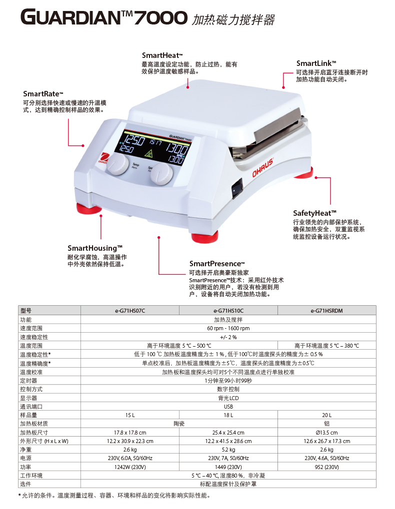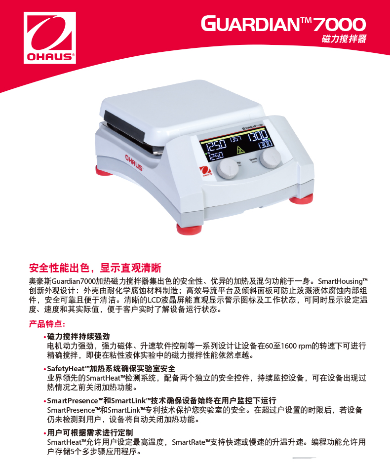 奥豪斯Guardian 7000™ 设计涵盖突出的安全性和优异的加热及搅拌功能。SmartHousing™性能是指设备机身耐抗化学腐蚀,且具有创新性的易于清洁的外形设计,玻璃操作面板的倾斜角可有效抵挡液体泼溅。明亮的LCD显示屏及直观的图标设计,可清晰显示温度,速度和时间,以帮助用户在实验室内轻松监控设备。
