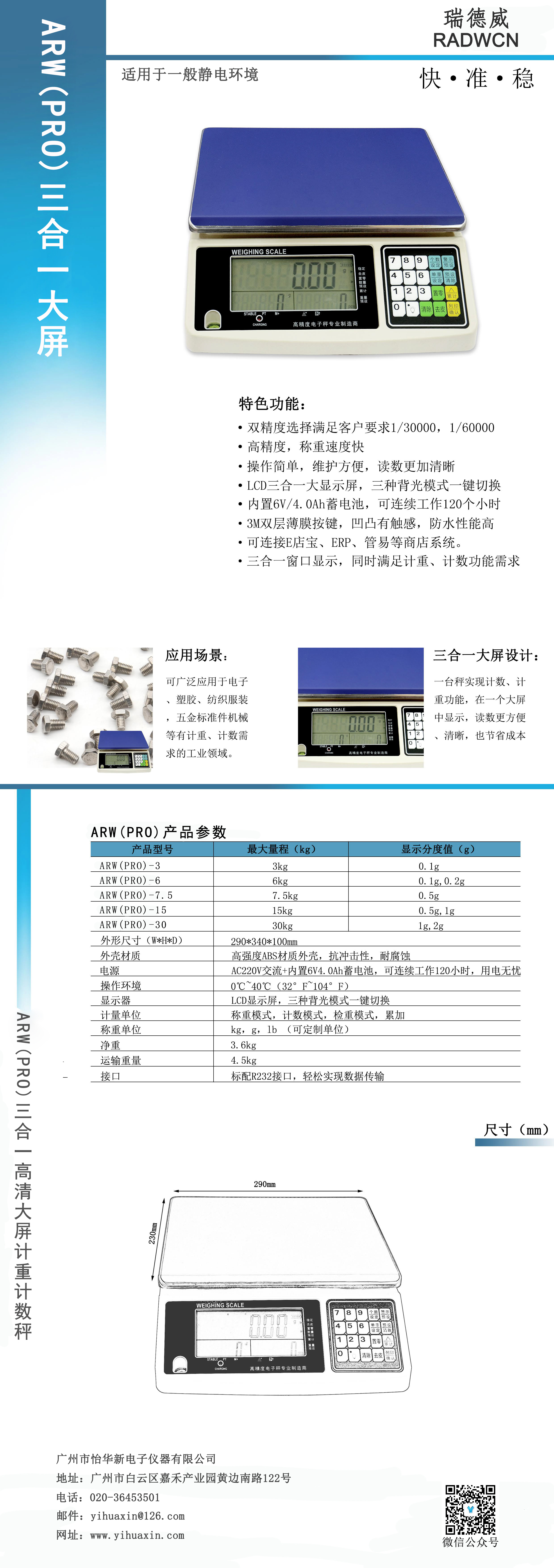 APW(PRO)三合一大屏电子计重计数秤,三屏合一,超大显示窗口集合计重、计数功能,读数更清晰,直视更方便。坚固耐用的ABS塑料外壳,抗冲击,耐磨损。