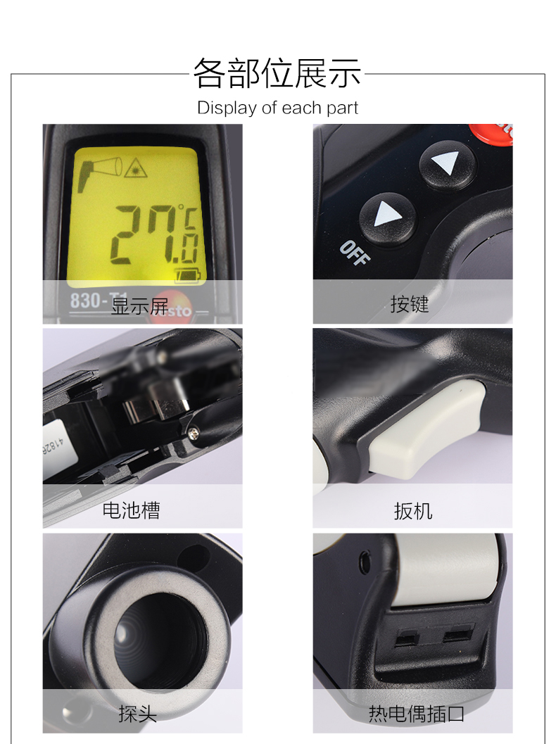 testo 830-T2具有2点激光瞄准,12:1光学分辨率,使用新的处理器后达到更精确的温度测量。标配的表面温度探头是测量发射率较低材料的理想仪器。