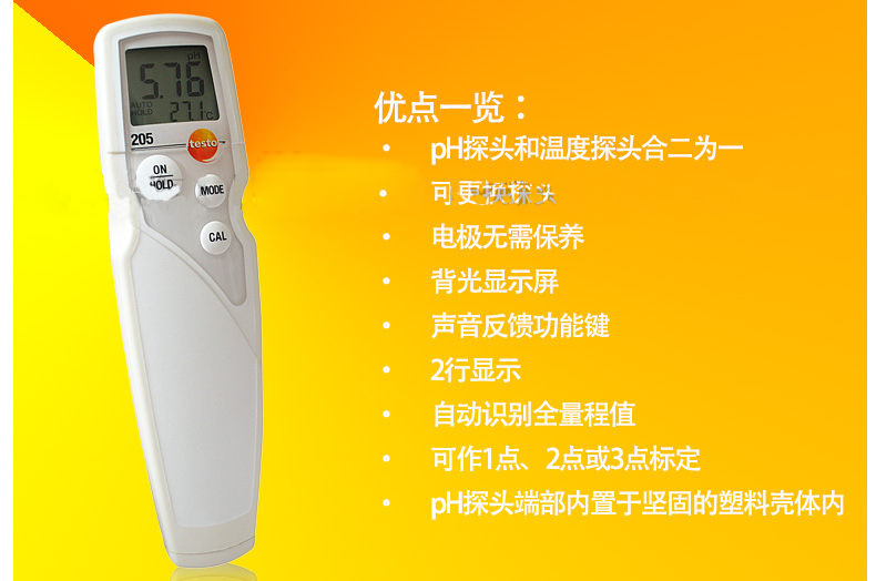 testo 205适于半固体中酸碱度pH值测量。集成温度传感器保证温度补偿,确保准确测量