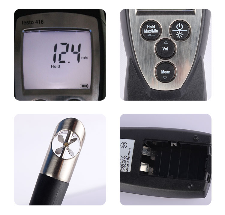 testo 416精密型叶轮风速仪配备背光大显示屏,快速清晰显示可靠的风速测量数据。