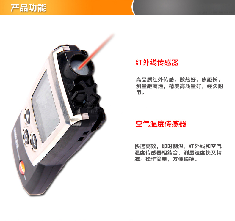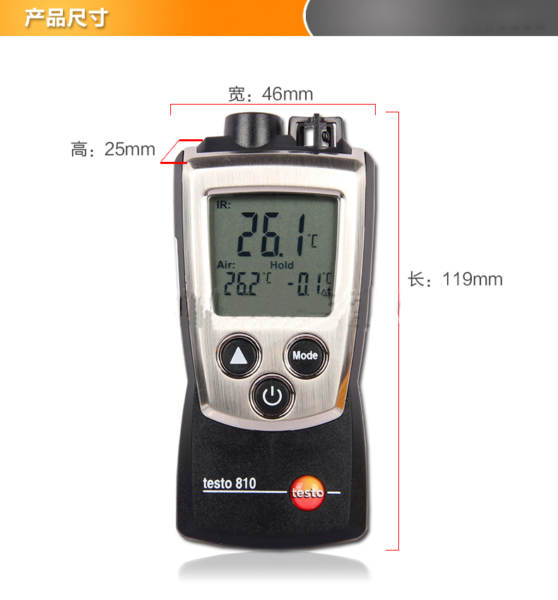 testo 810红外线测温仪,双通道测温,即可以红外非接触方式测量物体表面温度,又可通过内置NTC热敏电阻温度传感器同时测量空气温度,并自动进行温差计算并直接显示于带背光灯的显示屏上。