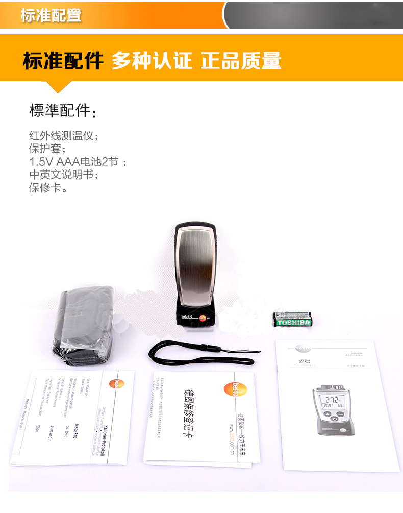 testo 810红外测温仪,内置NTC热敏电阻温度传感器,包括保护帽,保护套,电池和出厂报告。