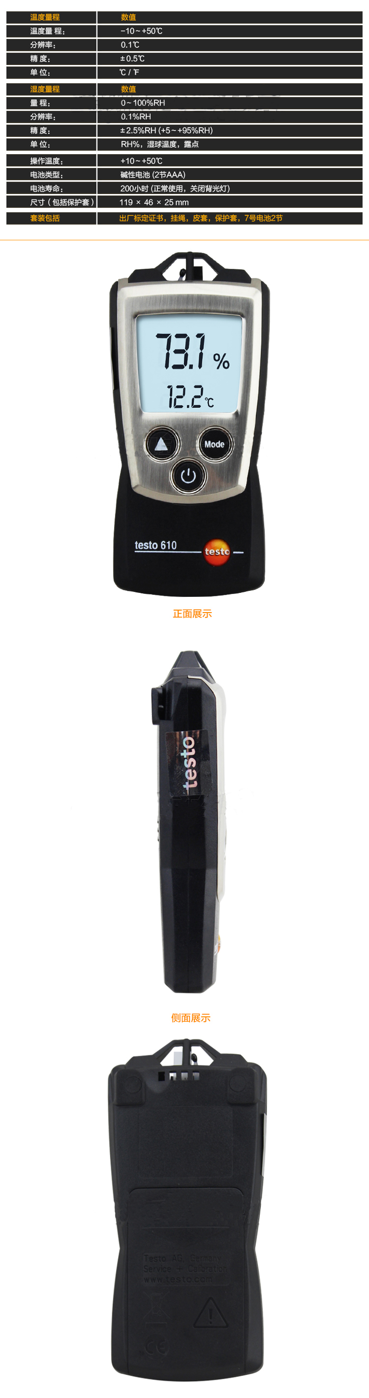 testo 610温湿度仪,包括保护帽,仪器包,电池和出厂报告。