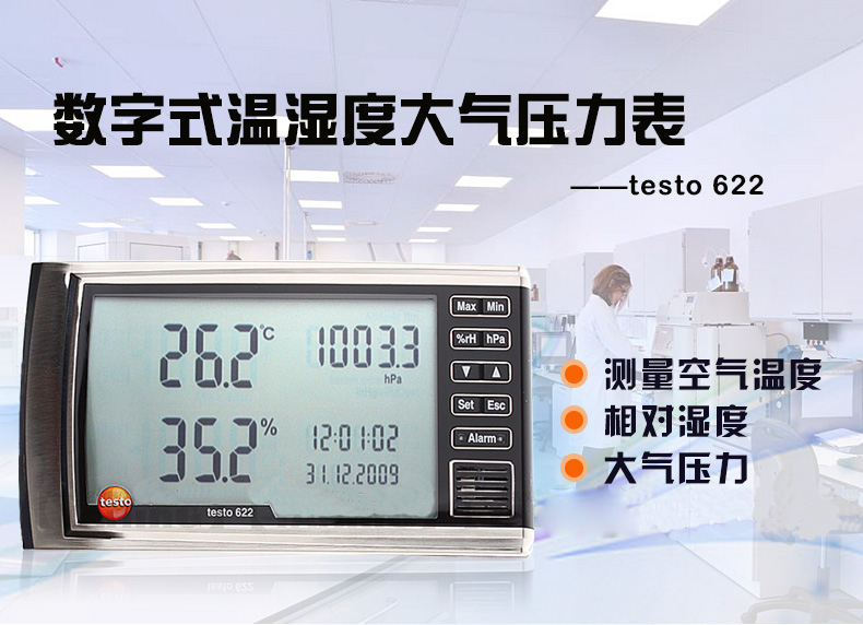 testo 622电子式温湿度大气压力表特别适用于监测环境参数。该仪器测量环境温度、相对湿度以及大气压力,并以每10秒一次的频率更新显示于超大显示屏上,同时显示时间和日期。当测量值超过限值时,自动发出LED视觉报警信号。