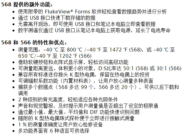 Fluke 568 和 566 接触式和非接触式二合一测温仪采用坚固、易用的人性化设计,可以轻松应对苛刻的工业、电气和机械环境。 这些工具的性能远远超出其他红外测温仪(或高温计),让用户可以在更多的应用领域中实现更高的工作效率。