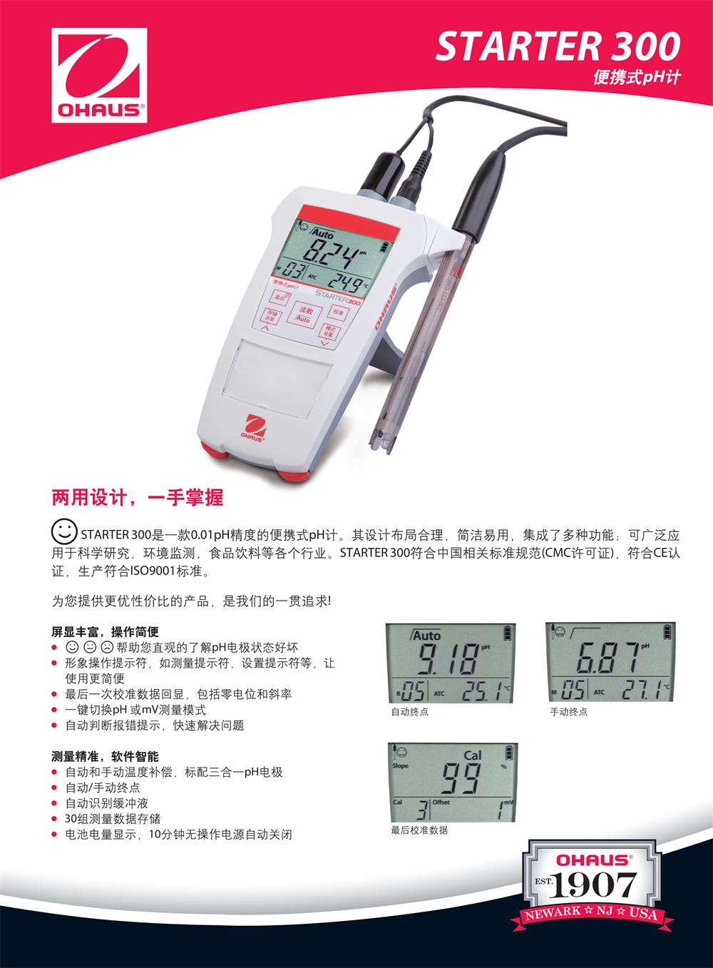 ST 300是一款0.01pH精度的便携式pH计。其设计布局合理,简洁易用,集成了多种功能;可广泛应用于科学研究,环境监测,食品饮料等各个行业。ST 300符合中国相关标准规范(CMC许可证),符合CE认证,生产符合ISO9001标准。