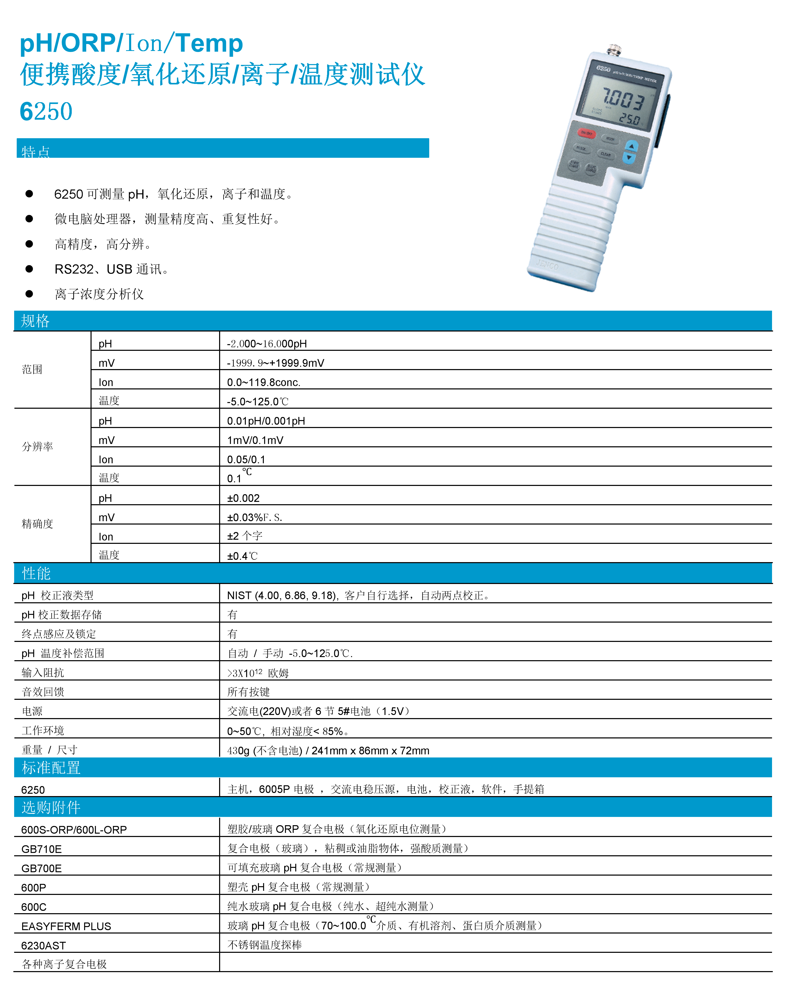 下一页:pH/ORP/Temp 便携酸度/氧化还原/温度测试仪 6230