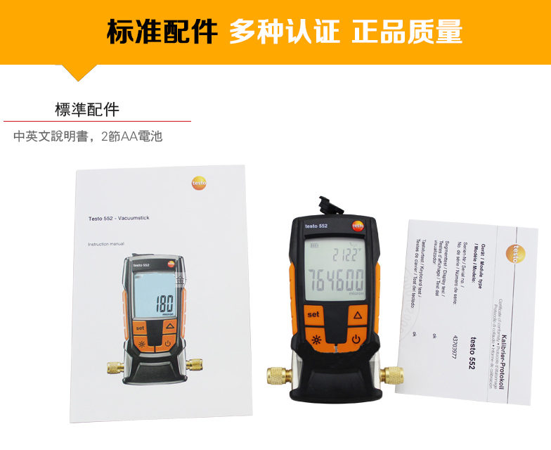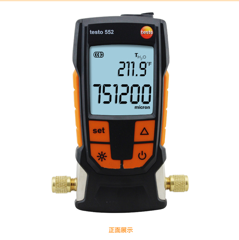testo 552 是一款数字式真空表,适用于制冷及热泵系统的真空度检测。除此之外,用户还能精确判断系统的除湿程度及杂质的去除程度 (例如:油,杂质气体等)。不同于其他的真空表,testo 552 是当前市场中,唯一一款采用免维护的绝对压力传感器,并可实现现场校准。
