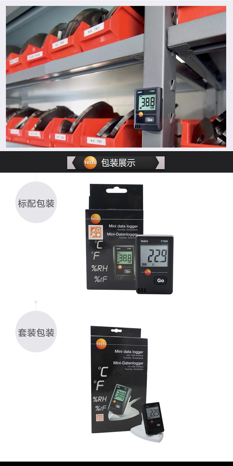 testo 174H迷你温湿度记录仪套装,包括有编辑和读取迷你温湿度记录仪USB数据底座,墙面安装支架,电池(2 x CR 2032 锂电池)及出厂报告。