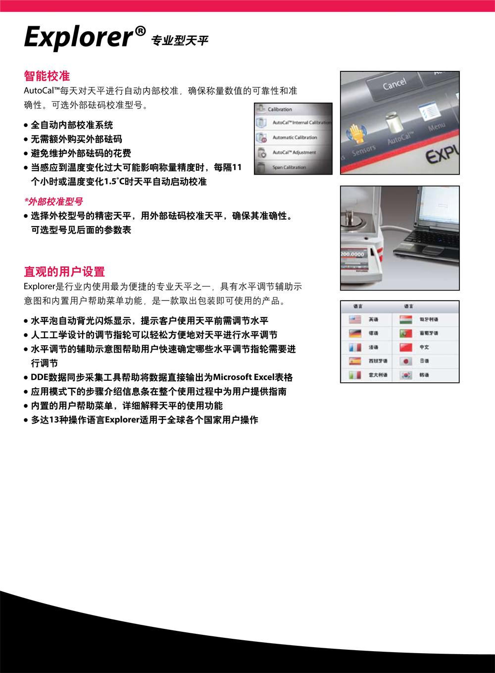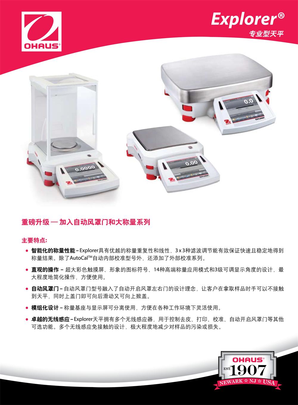 奥豪斯Explorer大称量天平提供您更直观和简便的操作体验,在市场同等级别具甚至高级别天平相比具有无与伦比的优越性。最大称量范围35公斤,配置5.7英寸全彩触摸屏,全自动校准,1秒内快速稳定。